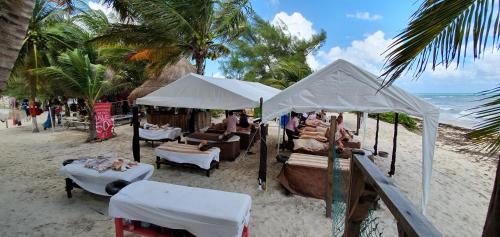 There are comfy chairs with foot stools and umbrellas. The Wellness Workshop at SUR Beach House. SUR Beach House Cabo San Lucas.